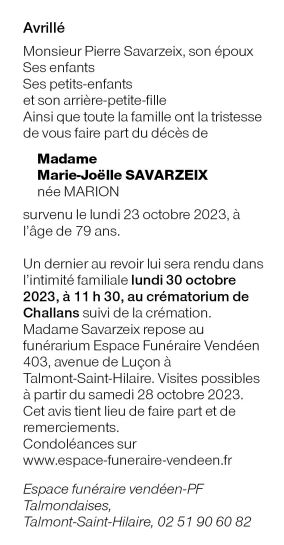 Décédée à Avrillé (85440, France) le lundi 23 octobre 2023 à l'âge de 79 ans