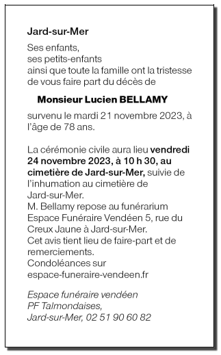 Décédé à Jard-sur-Mer (85520, France) le mardi 21 novembre 2023 à l'âge de 78 ans
