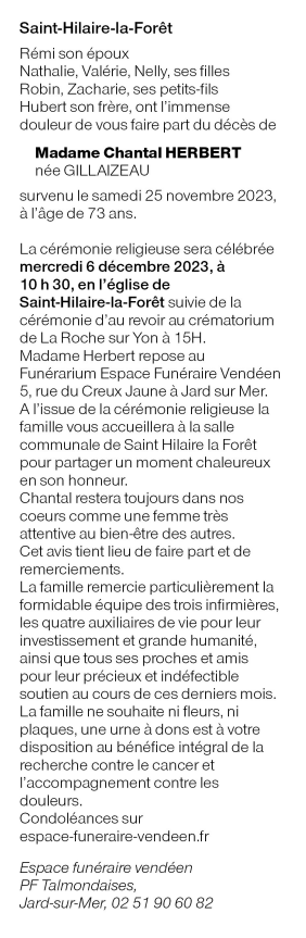 Décédée à Saint-Hilaire-la-Forêt (85440, France) le samedi 25 novembre 2023 à l'âge de 73 ans