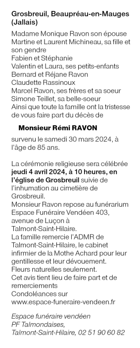 Décédé à Grosbreuil (85440, France) le samedi 30 mars 2024 à l'âge de 85 ans