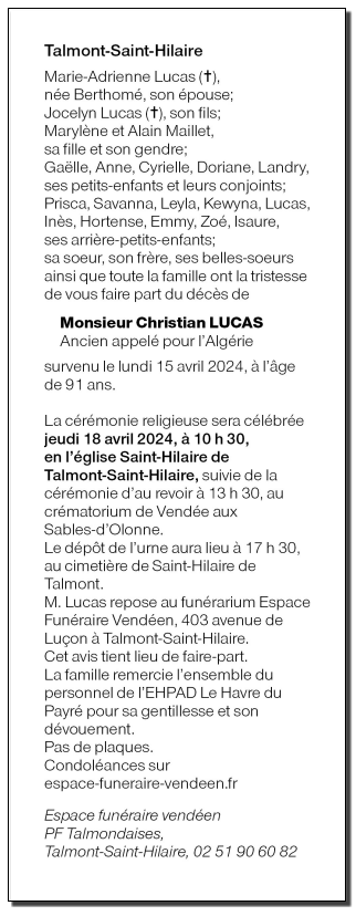 Décédé à Talmont-Saint-Hilaire (85440, France) le lundi 15 avril 2024 à l'âge de 91 ans