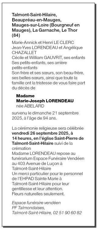 Madame Marie-Joseph LORENDEAU née ABELARD