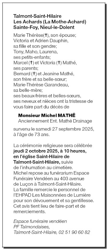 Décédé à Les Sables-d'Olonne (85100, France) le samedi 27 septembre 2025 à l'âge de 73 ans