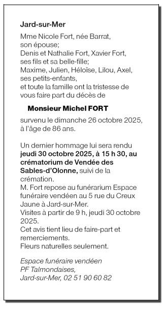 Décédé à Jard-sur-Mer (85520, France) le dimanche 26 octobre 2025 à l'âge de 86 ans