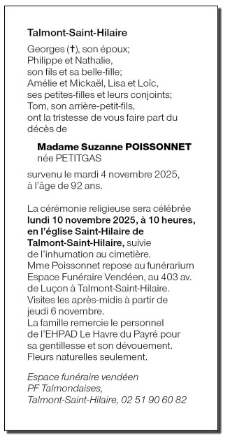 Décédée à Talmont-Saint-Hilaire (85440, France) le mardi 4 novembre 2025 à l'âge de 92 ans