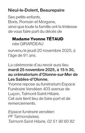 Décédée à Nieul-le-Dolent (85430, France) le jeudi 20 novembre 2025 à l'âge de 91 ans