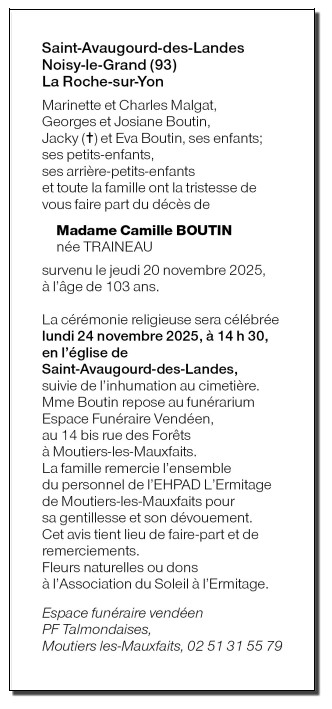 Décédée à Moutiers-les-Mauxfaits (85540, France) le jeudi 20 novembre 2025 à l'âge de 103 ans