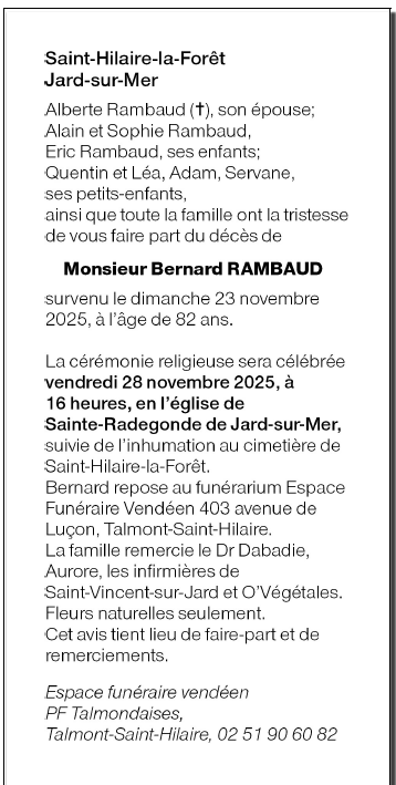 Décédé à Saint-Hilaire-la-Forêt (85440, France) le dimanche 23 novembre 2025 à l'âge de 82 ans