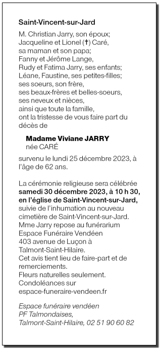 Décédée à Saint-Vincent-sur-Jard (85520, France) le lundi 25 décembre 2023 à l'âge de 62 ans