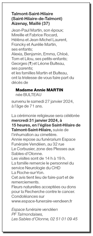 Décédée à La Roche-sur-Yon (85000, France) le samedi 27 janvier 2024 à l'âge de 71 ans