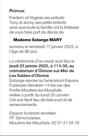 Décédée à Poiroux (85440, France) le vendredi 17 janvier 2025 à l'âge de 86 ans
