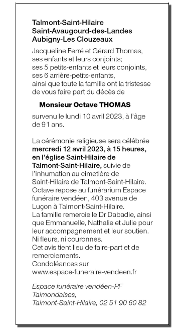 Décédé à Talmont-Saint-Hilaire (85440, France) le lundi 10 avril 2023 à l'âge de 91 ans