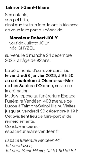 Décédé à Les Sables d'Olonne (85100, France) le samedi 24 décembre 2022 à l'âge de 92 ans