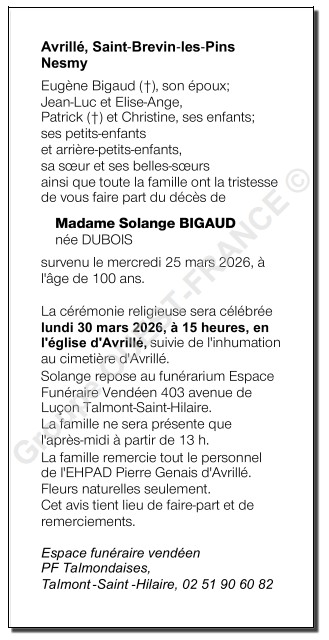 Décédée à Avrillé (85440, France) le mercredi 25 mars 2026 à l'âge de 100 ans