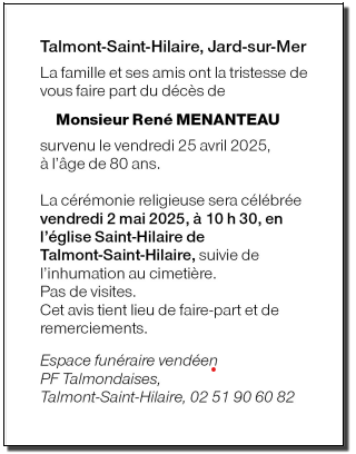Décédé à Jard-sur-Mer (85520, France) le vendredi 25 avril 2025 à l'âge de 80 ans