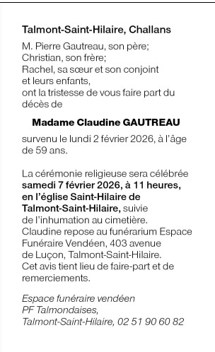 Décédée à Challans (85300, France) le lundi 2 février 2026 à l'âge de 59 ans