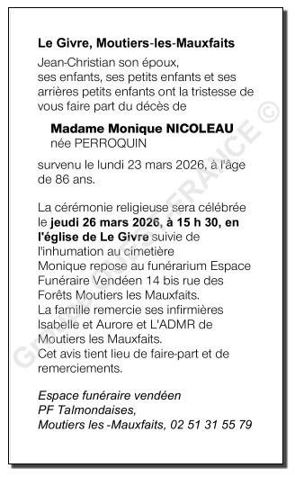 Décédée à Moutiers-les-Mauxfaits (85540, France) le lundi 23 mars 2026 à l'âge de 86 ans