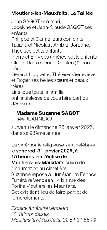 Décédée à Moutiers-les-Mauxfaits (85540, France) le dimanche 26 janvier 2025 à l'âge de 92 ans
