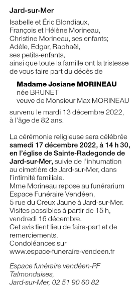 Décédée à Jard-sur-Mer (85520, France) le mardi 13 décembre 2022 à l'âge de 82 ans