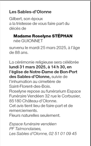 Décédée à Les Sables d'Olonne (85100, France) le mardi 25 mars 2025 à l'âge de 88 ans