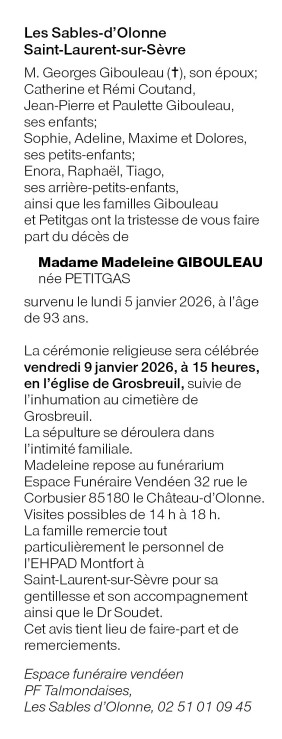 Décédée à Saint-Laurent-sur-Sèvre (85290, France) le lundi 5 janvier 2026 à l'âge de 93 ans
