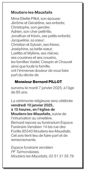 Décédé à Moutiers-les-Mauxfaits (85540, France) le mardi 7 janvier 2025 à l'âge de 85 ans
