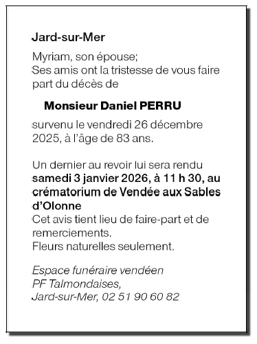 Décédé à Les Sables d'Olonne (85100, France) le vendredi 26 décembre 2025 à l'âge de 83 ans