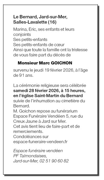 Décédé à Jard-sur-Mer (85520, France) le jeudi 19 février 2026 à l'âge de 91 ans