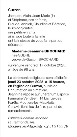 Décédée à La Roche-sur-Yon (85000, France) le vendredi 17 octobre 2025 à l'âge de 98 ans