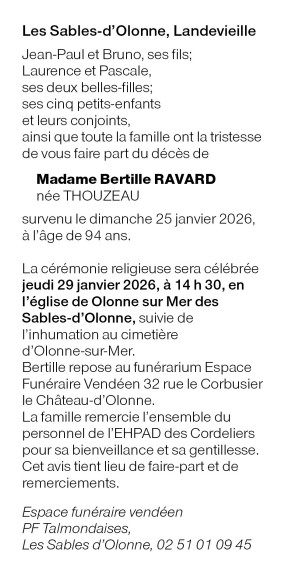 Décédée à Les Sables d'Olonne (85340, France) le dimanche 25 janvier 2026 à l'âge de 94 ans