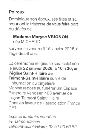 Décédée à Talmont-Saint-Hilaire (85440, France) le vendredi 16 janvier 2026 à l'âge de 58 ans