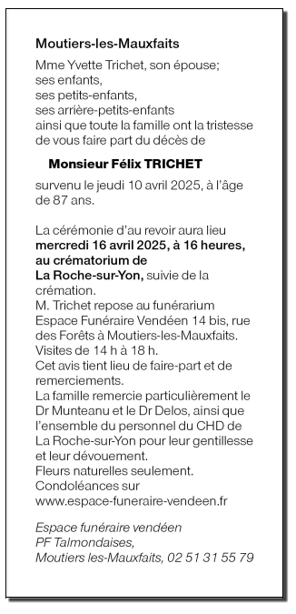 Décédé à La Roche-sur-Yon (85000, France) le jeudi 10 avril 2025 à l'âge de 87 ans