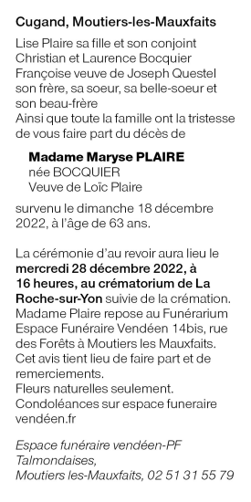 Décédée à La Roche-sur-Yon (85000, France) le dimanche 18 décembre 2022 à l'âge de 63 ans