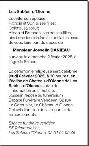 Décédé à Les Sables d'Olonne (85100, France) le dimanche 2 février 2025 à l'âge de 86 ans