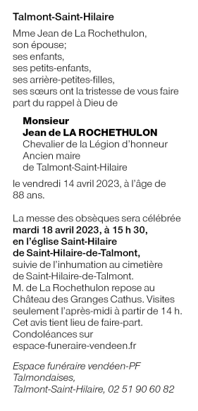 Décédé à Talmont-Saint-Hilaire (85440, France) le vendredi 14 avril 2023 à l'âge de 88 ans