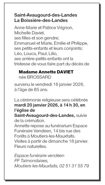 Décédée à Moutiers-les-Mauxfaits (85540, France) le vendredi 16 janvier 2026 à l'âge de 85 ans