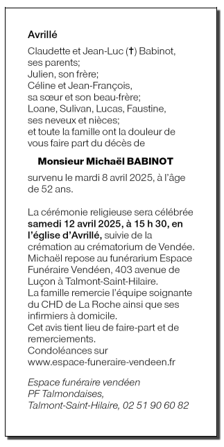 Décédé à La Roche-sur-Yon (85000, France) le mardi 8 avril 2025 à l'âge de 52 ans