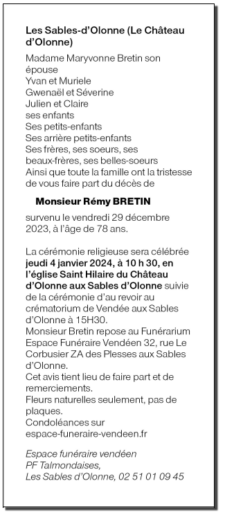 Décédé à Les Sables d'Olonne (85100, France) le vendredi 29 décembre 2023 à l'âge de 78 ans