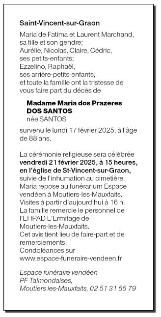 Décédée à Moutiers-les-Mauxfaits (85540, France) le lundi 17 février 2025 à l'âge de 88 ans