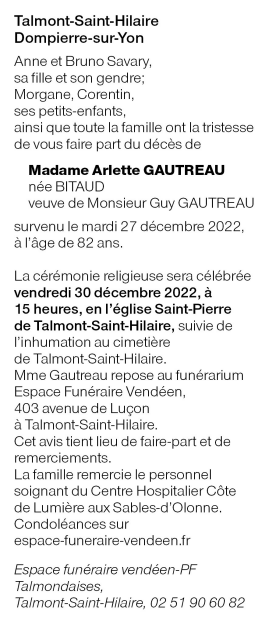 Décédée à Les Sables d'Olonne (85100, France) le mardi 27 décembre 2022 à l'âge de 82 ans