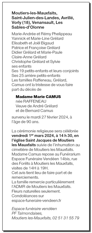 Décédée à La Roche-sur-Yon (85000, France) le mardi 27 février 2024 à l'âge de 90 ans