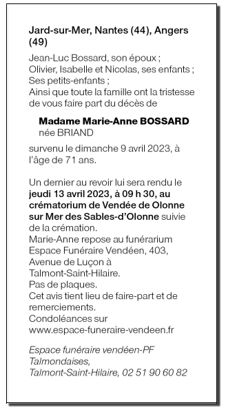 Décédée à Puyravault (85450, France) le dimanche 9 avril 2023 à l'âge de 71 ans