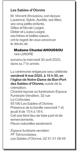 Madame Chantal AHOUSSOU née LIAIGRE