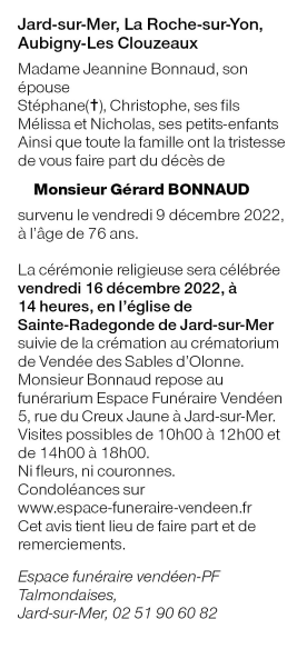 Décédé à Jard-sur-Mer (85520, France) le vendredi 9 décembre 2022 à l'âge de 76 ans