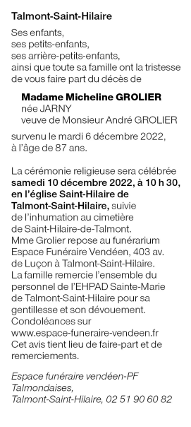Décédée à Talmont-Saint-Hilaire (85440, France) le mardi 6 décembre 2022 à l'âge de 87 ans