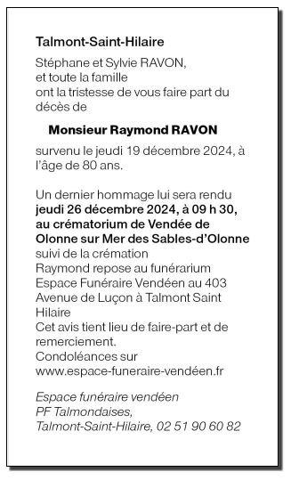 Décédé à Grosbreuil (85440, France) le jeudi 19 décembre 2024 à l'âge de 80 ans