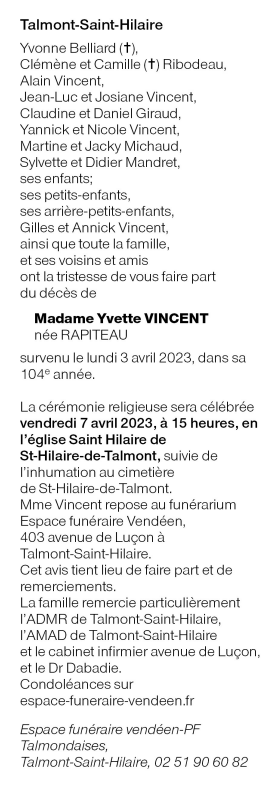 Décédée à Talmont-Saint-Hilaire (85440, France) le lundi 3 avril 2023 à l'âge de 103 ans