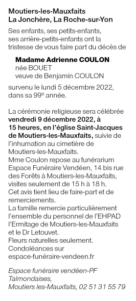 Décédée à Moutiers-les-Mauxfaits (85540, France) le lundi 5 décembre 2022 à l'âge de 98 ans