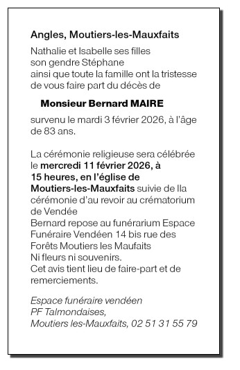 Décédé à Moutiers-les-Mauxfaits (85540, France) le mardi 3 février 2026 à l'âge de 83 ans