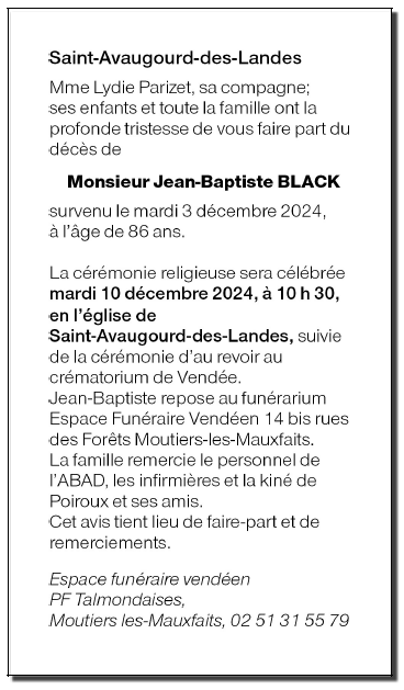 Décédé à Saint-Avaugourd-des-Landes (85540, France) le mardi 3 décembre 2024 à l'âge de 86 ans